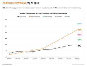 SAN FRANCISCO, Oct. 21, 2025 (GLOBE NEWSWIRE) -- Menlo Ventures, a leading venture capital firm investing at the forefront of artificial intelligence, today released its inaugural State of AI in Healthcare Report, showing that AI spending across healthcare reached $1.4 billion in 2025, almost tripling last year’s total. The data also reveals that healthcare organizations have adopted AI 2.2x faster than the broader economy.